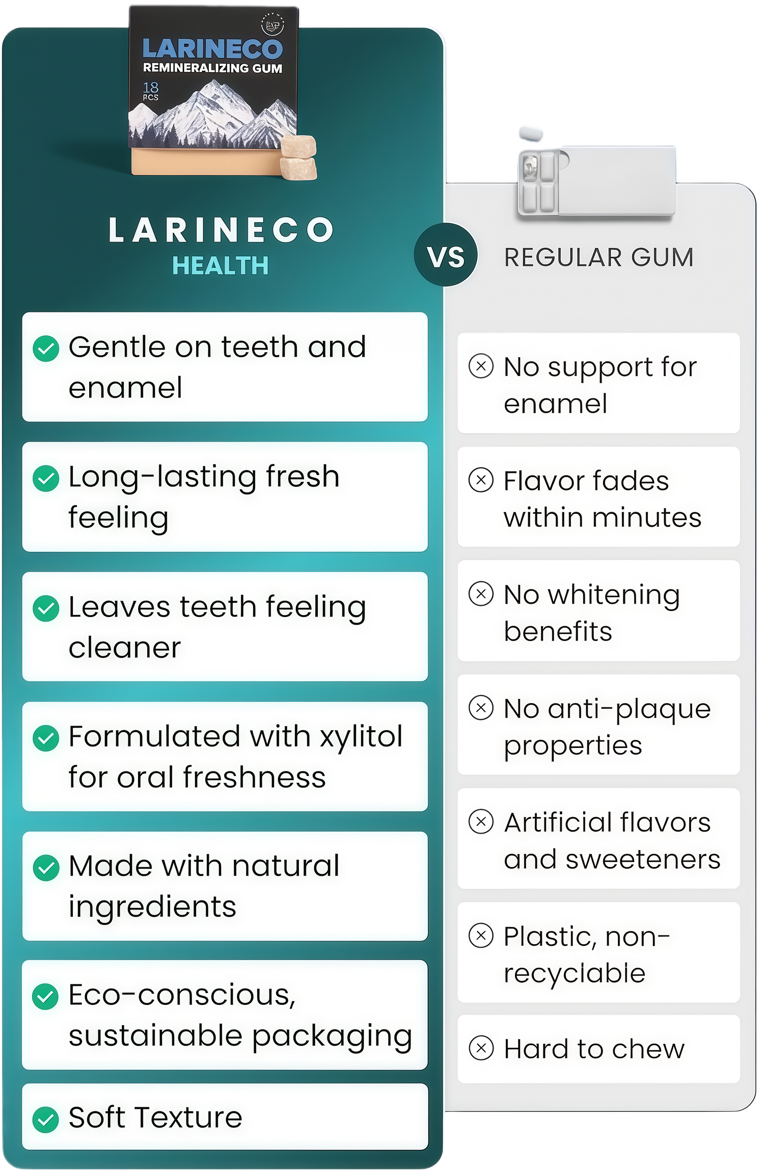 - No Aspartame, No Dyes, No Plastic Gum Base: Larineco gum is made without artificial dyes, synthetic sweeteners, or plastic gum bases. It uses a chicle-based natural gum formula and botanical flavor oils.